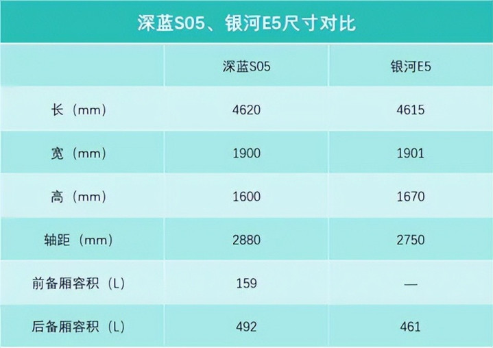 考虑到日常家用需求,空间和乘坐体验,也是关键环节。从尺寸来看,两台车的三围其实是大差不差,车长都是4米6出头、车宽都是1米9左右。但是,深蓝S05的轴距达到2880mm,相比于银河E5的2750mm,有着10公分+的优势,由此也带来了更长的轴长比,车长得房率高达66%,简单来说,就是在同等的外观尺寸下,可以带来更宽敞的空间,不管是平常家用,载着家人出门,或者是偶尔载上三五好友出行,深蓝S05的乘坐空间会更游刃有余。而银河E5的空间能满足日常需求,但不如深蓝S05宽裕。