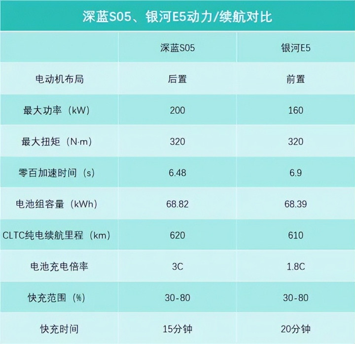 续航部分,深蓝S05搭载68.82kWh的电池组,整车CLTC纯电续航达到620km。深蓝S05电芯来自宁德时代,属于一线大厂,而且采用的是金钟罩电池,安全性有保障,并且金钟罩电池“装机量”也很大,也经过了市场的考验。银河E5搭载68.39kWh的神盾短刀电池,整车CLTC纯电续航是610km,其电芯来自蜂巢能源,也属于大厂,但知名度可能就没宁德时代高了。补能方面,深蓝S05搭载3C快充,银河E5充电倍率是1.8C,从30%充到80%,深蓝S05最快只需要15分钟,银河E5需要20分钟,两台车的充电速度都还比较快,单看的话,差距也不大。但是,试想一下,咱们如果长途出行,路程超过1000km,需要反复充电的话,那深蓝S05或许就能节约出半个小时以上的时间了。