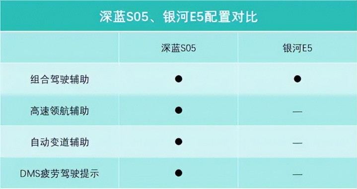 辅助驾驶系统是时下的关键配置,毕竟这项配置既关系到驾驶,也关系到安全。深蓝S05全系标配深蓝驾驶辅助DEEPAL AD PRO,在常规的组合驾驶辅助的基础上,深蓝S05还支持高速驾驶领航辅助、泊车辅助、安全辅助、DMS疲劳驾驶提示等等功能,在高速上行驶时,可以实现自动变道辅助、智能限速辅助等功能。银河E5就只能实现基础的组合驾驶辅助功能,不支持高速领航辅助,通行效率会稍低一些,并且也需要人工多操作一些,而且银河E5也不支持疲劳检测,就需要咱们自己多注意了。如果是长途出行,比如自驾,或者马上春节长途返乡,深蓝S05可以大幅缓解驾驶疲劳,银河E5虽说也支持辅助驾驶,但能力相对有限。